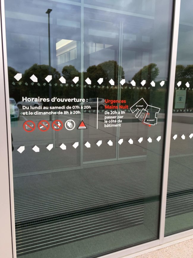 Projet : Signalétique – Restructuration de la Clinique Saint Léonard – Village Santé Angers Loire à TRELAZE Client : Clinique Saint Leonard Date de réalisation : 1e tranche Juillet 2020 Architecte : AIA Architectes Création signalétique : AIA Architectes Bandes de visualisation, Plan et horaires : Bandes en adhésif vinyle teinté masse blanche découpée au…
