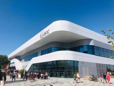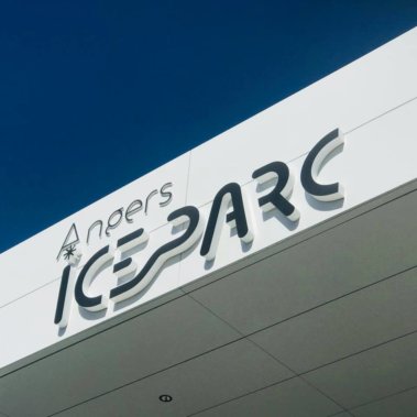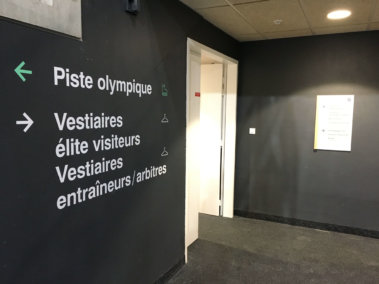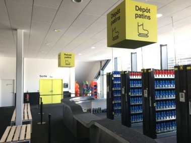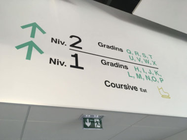 Adhésif : Ensemble de signalétique de porte, de grands directionnels, d’identification des ascenseurs et escalier réalisé en lettrage adhésif imprimé aux couleurs de la patinoire