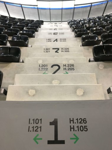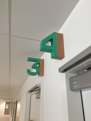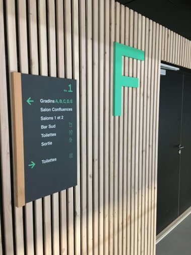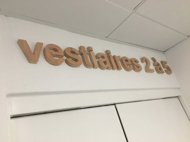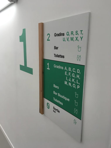 Identification des gradins :Lettres découpées en plexiglass ép. 20 mm, laquées.